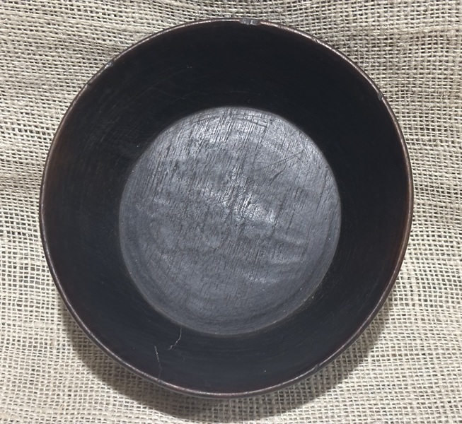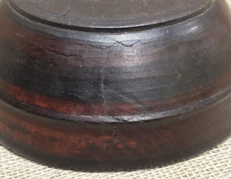 Nice 18th century treen turned bowl. Dark wood probably walnut, personal eating bowl. As seen in photos shrinkage cracks on one side with glue repair. Measures 6 1/2"-6 3/4" out of round.