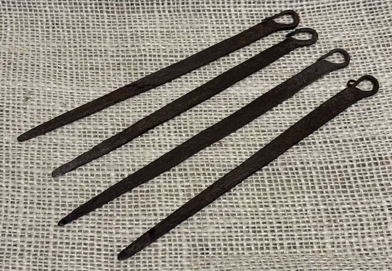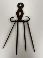Wonderful 18th century forged iron skewer set. Nice decorative shaped holder. Surface as expected for age. Holder measures 4” long , 4” wide. Skewers measure 6 1/4”-6 3/4”.