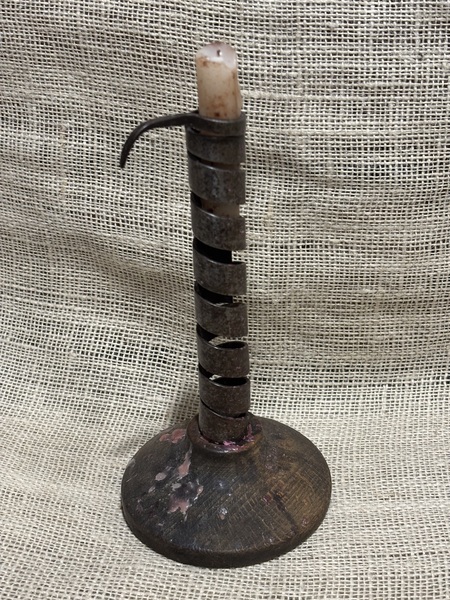 Wonderful, rare whitesmith rush holder. England c.1750, twisted stems and decorated counterweight on wooden turned base. As seen in photos base has stable crack and loss on one side from what looks to be burning at some point. Measure 10 5/8" tall. From a wonderful lighting collection we just purchased in Massachusetts.