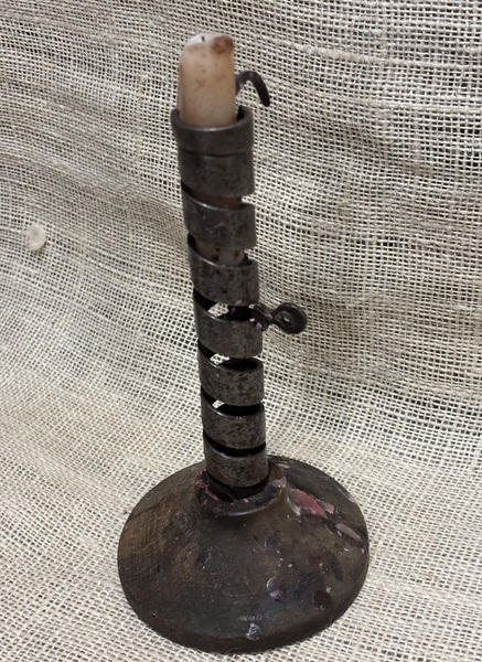Nice 18th c. Whitesmith courting candleholder. Chair hook and intact candle lifter. Cleated to wooden base, 8” tall with a 4 1/4” base diameter.
