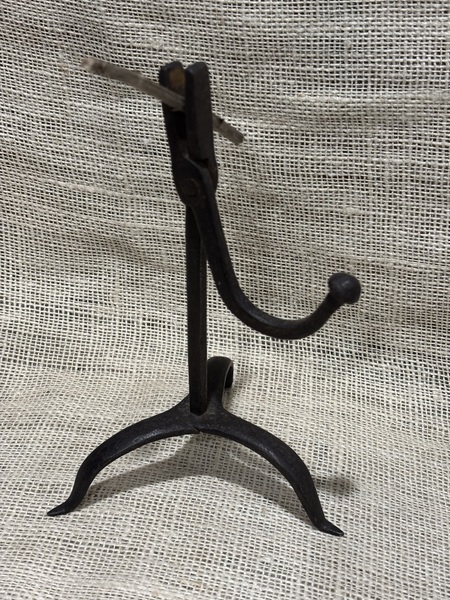 Nice late 18th-early 19th century wrought iron rushlight. Tripod base with point feet, point ball counterweight. Rectangular jaw with rivet hinge. Measures 8 3/8" tall.
