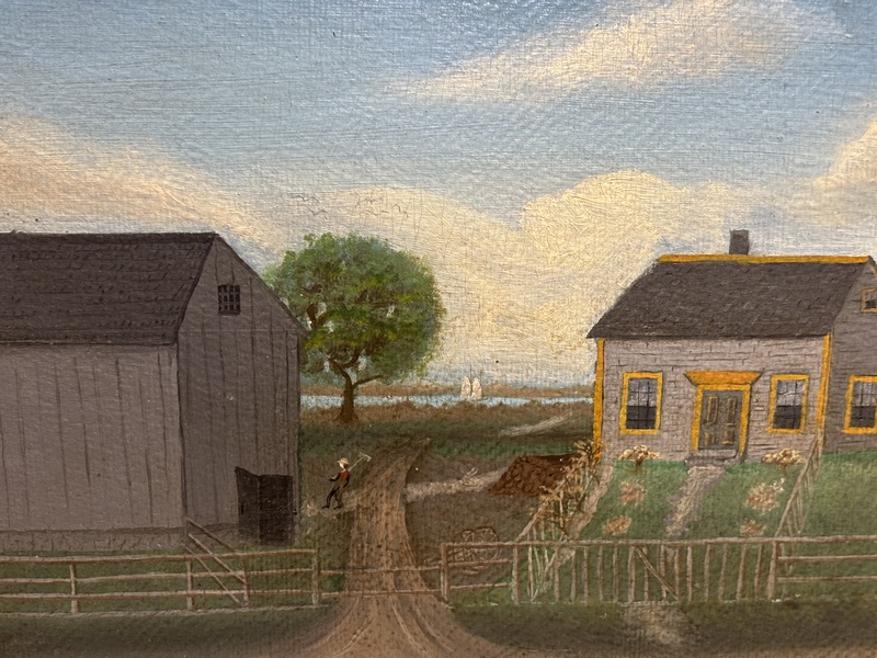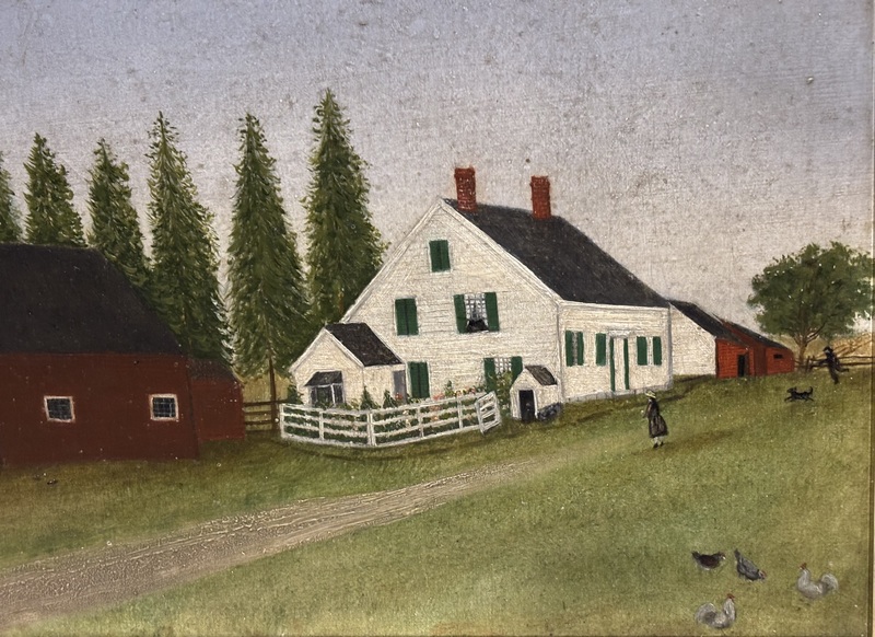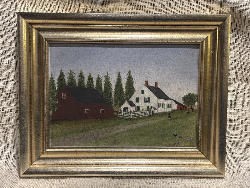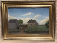 Wonderful primitive farmhouse painting. American, circa 1900. Nice image with great detail. Oil on board, modern frame. Measures 12 1/2" x 16 3/4".