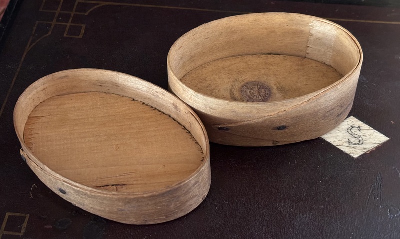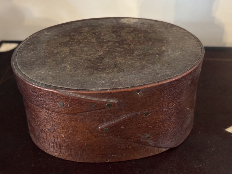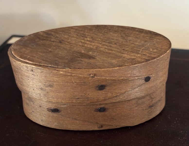 Sweet miniature pantry box. 19th century, oval bentwood original unpainted surface. Copper tack and peg construction. Measures 4" long, 2 5/8" wide, 1 3/4" high.