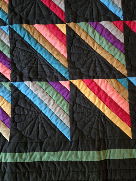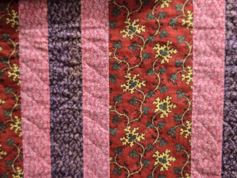Bold colors make this Bar Quilt pop! Tones of pink, red and purple define the color palette and although they clash, these colors are dynamite! Size is generous and would fit a Queen bed