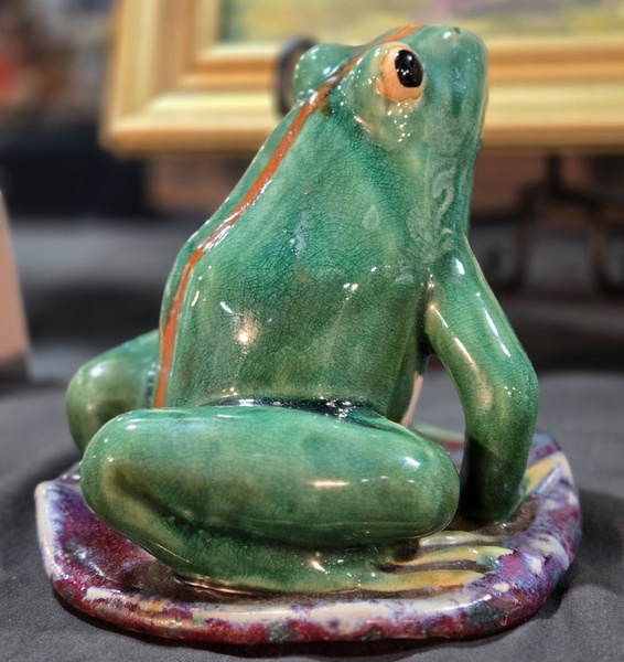 Every garden and every book shelf needs a friendly frog! This example in high glaze offers color and form to please everyone. Size: about 6" tall. No artist identification.