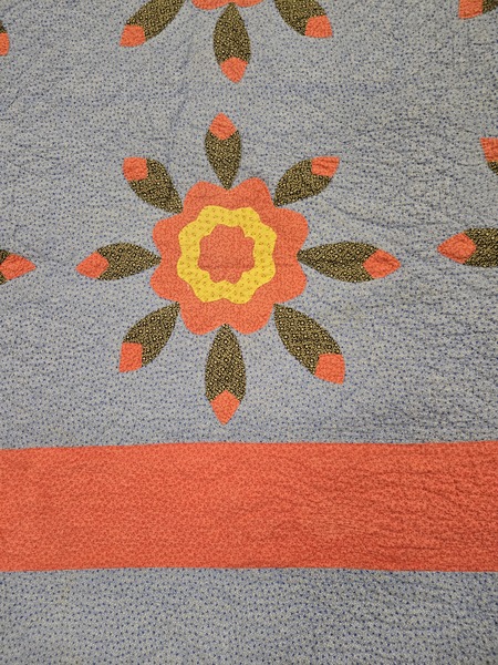 A fine cotton quilt in the typical color palette of southeastern Penna in tones of pink, yellow against a sky blue field. This quilt dates from the 1930-40's and is in excellent condition. Measurements: 76 inches square.