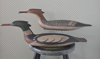 Bob Biddle (1937-2025) was born in Northeast Maryland in 1937. He later grew up on the Elk River. Although educated as an aelectrical engineer, he enjoyed swimming, crabby and hunting. He began to make decoys as a young teen and later in life he retired to focus on studio workshops and exhibiting decoys at shows on the East Coast. Recognized by the Harve de Grace Museum, he was a skilled craftsman of Windsor chairs. This pair is a beautiful addition to one's decoy collection. Sold as a pair only.