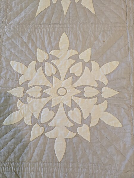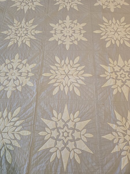 Beautiful soft grey and white SNOWFLAKE QUILT of cotton. This is a kit quilt that was popular in the 1960's. This example is quite large and would easily fit a queen size bed. Condition is excellent with only 1-2 minor small stains that are barely noticed.