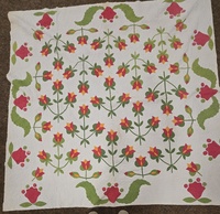 This quilt dates from the second or third quarter of the 19th century. The red cherries are highlighted with Trapunto work. The border is strong and serves to frame the design. In some places, there is wear and the fabric has flattened but the overall pattern is delightful. There is evidence of wear on the binding, but the clarity of design makes this quilt worthwhile. Size 78" Square. Found in western New York State. Freshly laundered.