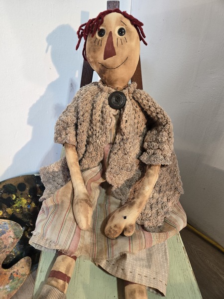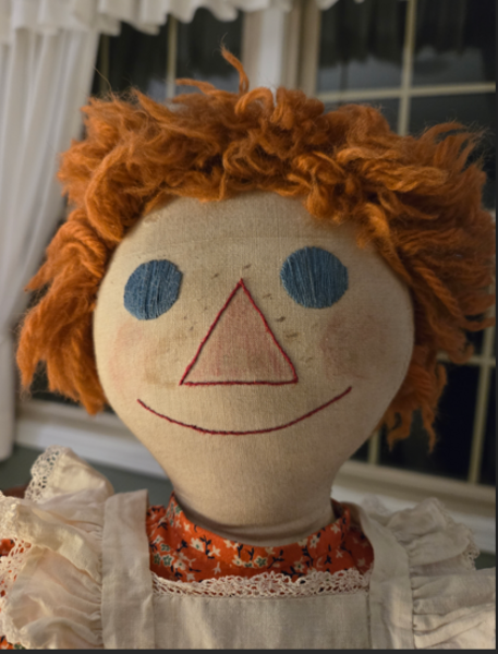 This much loved Raggedy Ann Doll features bright blue eyes and not the usual shoe button black eyes. Her dress and apron are perfect. She appears to be one-of-a-kind and not a production doll. Size: 19" tall Clean condition with a great face!