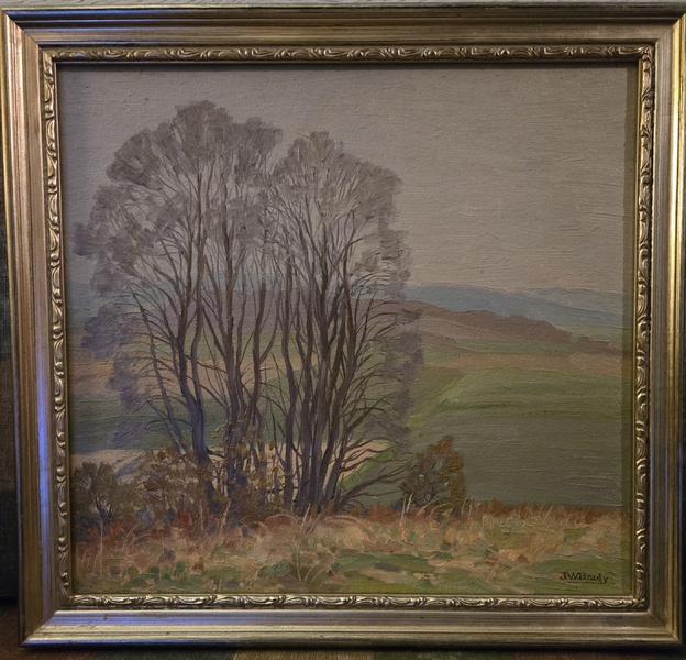 Found in Penna, this pleasant painting of a tree silhouette against a soft gray sky is well done. Although the artist did not sign the work, it is worthy of a place in your home. Frame is not original but is a soft silver/champagne color